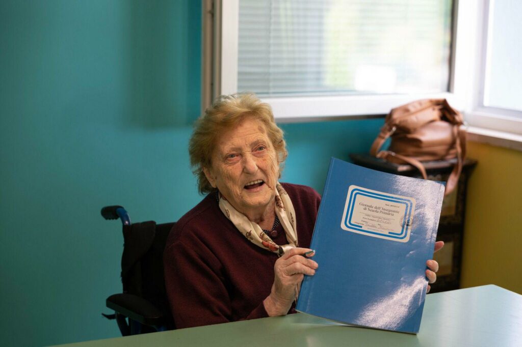 Durante la cerimonia di conferimento di una targa ufficiale a Imelda, il sindaco di Città di Castello l’ha invitata a presiedere simbolicamente l’avvio del nuovo anno scolastico. Imelda ha accettato con entusiasmo e questa mattina ha coronato il sogno di una vita, anche se solo per qualche ora. Ha preso in mano un registro, i libri e si è seduta dietro una cattedra per poter guardare negli occhi i bambini. È stato un momento emozionante per tutti.