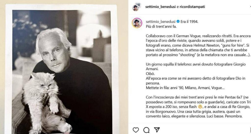 “Entrare in quel luogo era come entrare in un convento laico: tutto grigio, luci basse, silenzio. Un posto molto Armani” racconta Benedusi. Il servizio prevedeva un ritratto con il gatto di Re Giorgio ma non fu semplice: “Il gatto non voleva stare in braccio a lui e lui non voleva tenerlo. I peli bianchi sulla maglia nera erano un problema. Non c’era Photoshop. Non esisteva il ‘poi sistemiamo in post’”. Nonostante le difficoltà, il servizio riuscì e fu pubblicato sulle pagine di Vogue. “Armani aveva un carisma enorme. Era gentile ma incuteva rispetto solo per quello che rappresentava. Qualsiasi cosa passasse dalle sue mani diventava Armani: una camicia bianca, una foto, un’immagine”.