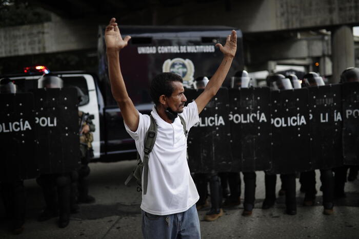 epa10832580 A man gestures as demonstrators clash with the police during a protest against mining, in front of the National Assembly in Panama City, Panama, 31 August 2023. The Ombudsman of Panama reported that it is investigating the alleged excessive use of force by the National Police against the demonstrators who are holding protests this week against the operation of an open-pit copper mine in the country, the largest of Central America. EPA/Bienvenido Velasco