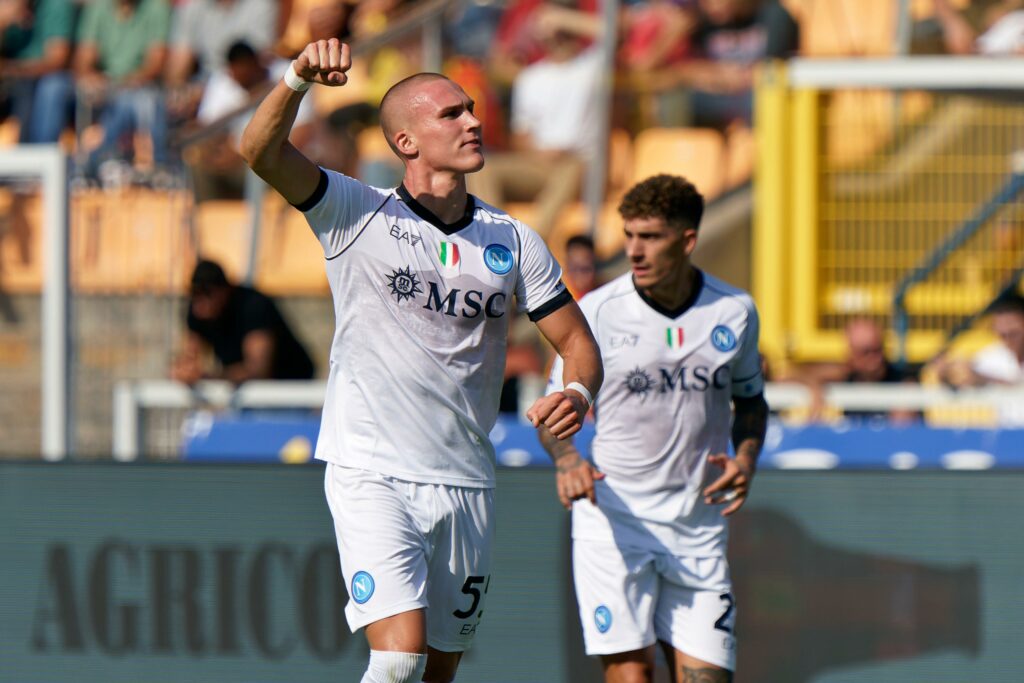 Il Napoli ha giocato senza Osimhen dall’inizio per la prima volta in questa stagione, con Simeone preferito come attaccante titolare, nonostante Osimhen sia stato il capocannoniere della scorsa stagione. Il Lecce è partito molto aggressivo, pronto a combattere su ogni pallone, sostenuto dall’entusiasmo dei più di 30mila tifosi presenti allo stadio Via del Mare. Tuttavia, è stato il Napoli a ottenere la prima occasione da gol, con un tiro di Lindstrom. Al secondo tentativo è arrivato il vantaggio: Zielinski ha calciato una punizione perfetta al centro dell’area, dove Ostigard ha segnato di testa, realizzando il suo primo gol in Serie A.