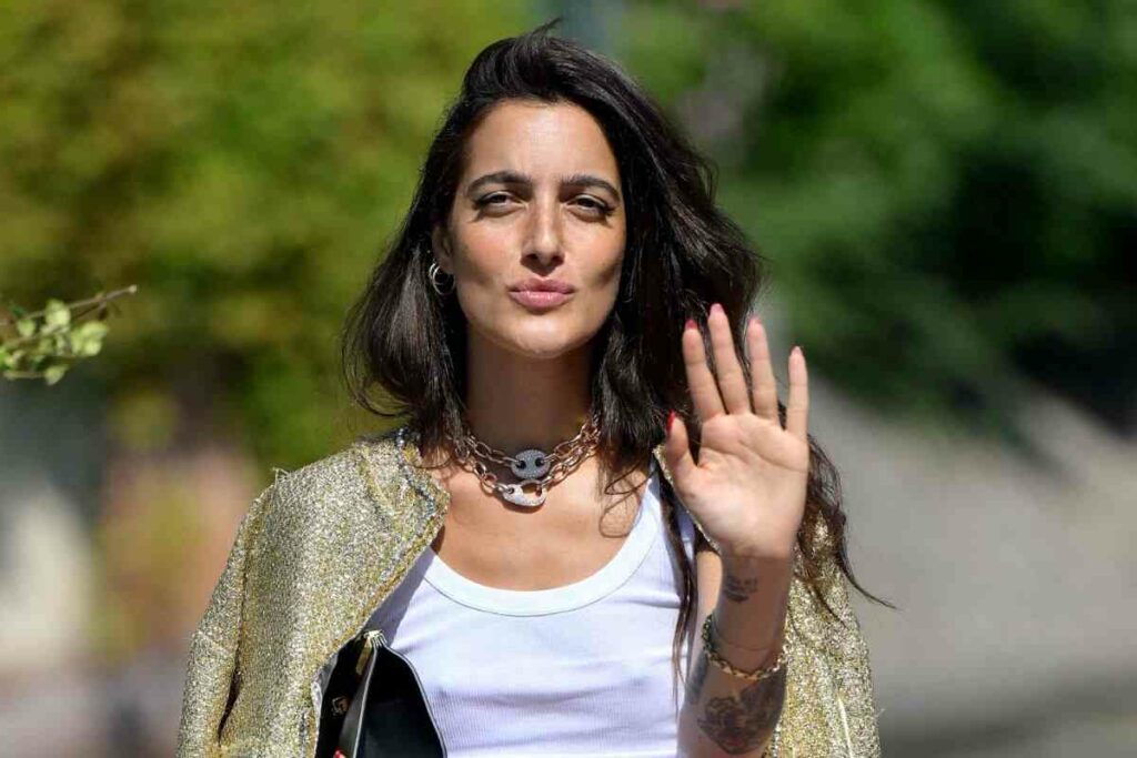 Totalmente bionda, infatti, ha partecipato al Festival di Sanremo 2023. Ha anche posato come testimonial nella campagna di Superga Lovers. Per lanciare il suo nuovo singolo “Canzone d’estate”, ha giocato sull’ironia, sfruttando il cambio di colore dei capelli che ha suscitato diverse critiche. A Venezia, però, è tornata fedele al suo look corvino. Poco prima di camminare sul red carpet, per il suo arrivo in Laguna, la cantante ha scelto un look casual chic con jeans a vita regolare, canottiera bianca e giacca dorata appoggiata sulle spalle. In mano, una pochette nera in pelle, in coordinato con i mules dal tacco a spillo.