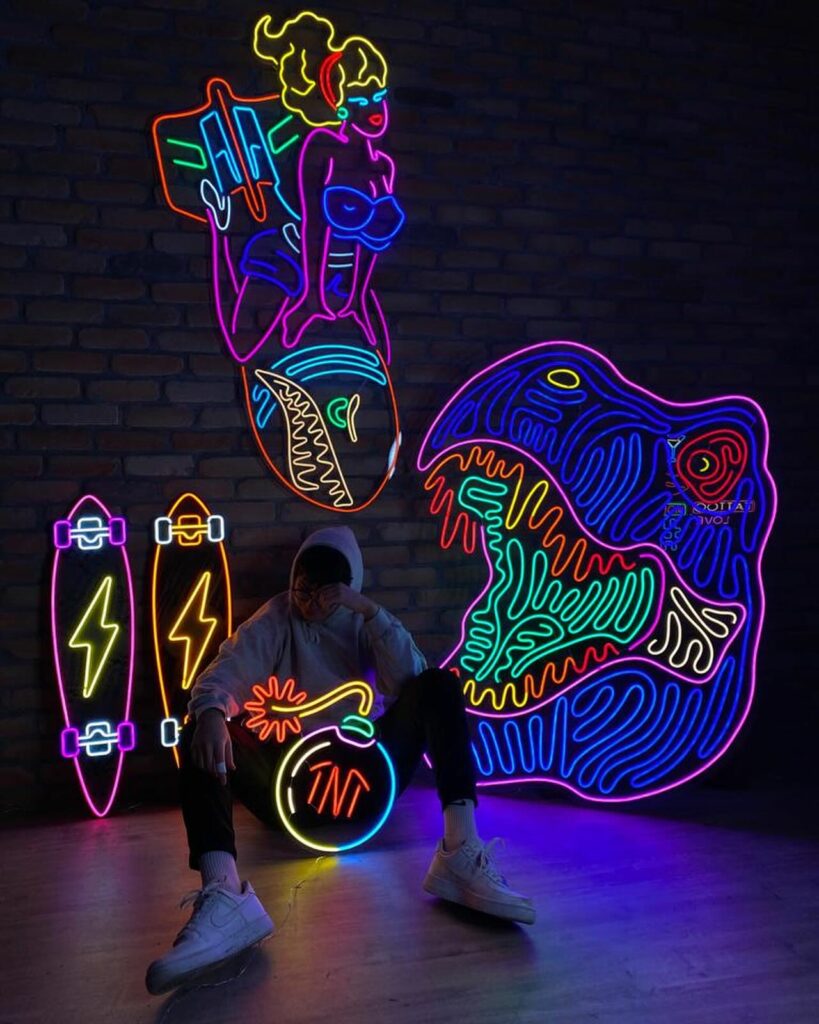 La vasta gamma di lampade neon di Neon Flow, disponibili in molteplici colori e forme, ti consente di personalizzarle completamente. Acquistare una lampada da Neon Flow significa creare un’opera d’arte luminosa che riflette il tuo stile in modo unico ed originale.