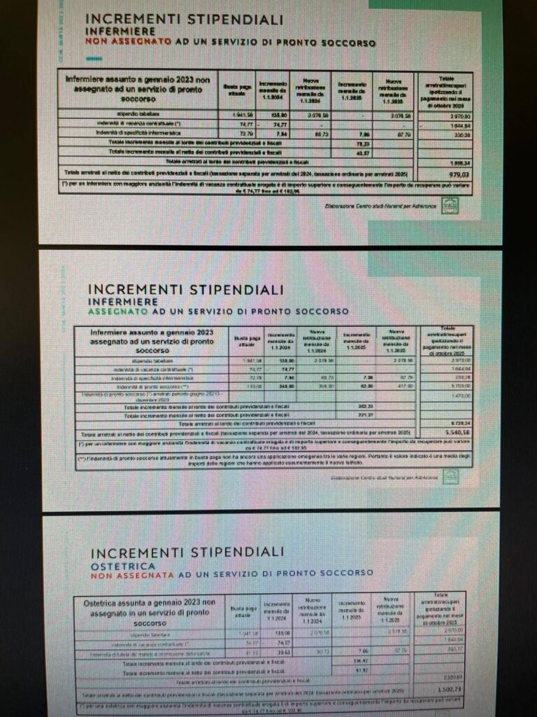 , l’aumento contrattuale mensile lordo a regime è di 150 euro. Per chi invece presta servizio nei dipartimenti di emergenza-urgenza c’è un incremento più sostanziale frutto dei 175 milioni previsti per il personale di pronto soccorso da distribuire con accordi regionali e poi gli arretrati da giugno 2023. Aumenti economici che sono stati ulteriormente rafforzati dal taglio del cuneo fiscale per le retribuzioni fino a 40mila euro, oltre che dalla detassazione degli straordinari degli infermieri al 5% con l’ultima manovra di bilancio.