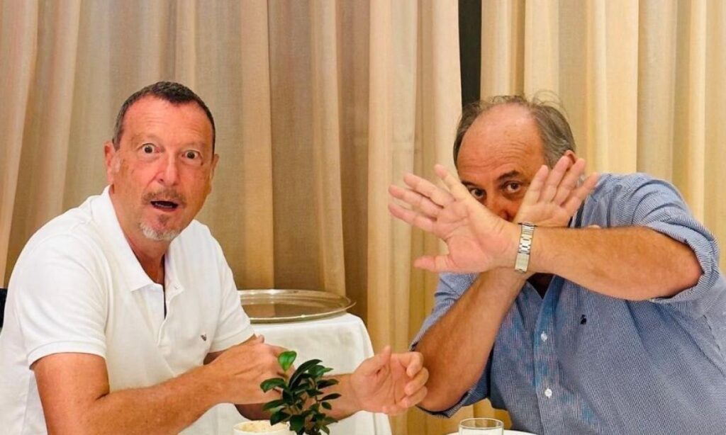 However, today the attention has been captured by a photo posted by Gerry Scotti on his Instagram profile. In the photo, he and Amadeus are sitting at a table. Amadeus has a surprised expression, with his mouth wide open and his eyes widened, while Gerry Scotti covers his face to avoid being photographed. The caption of the photo reads: “Well, they caught us.”