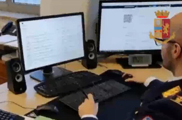 Un fermo immagine mostra un momento dell'operazione che ha portato i militari del Comando Provinciale della Guardia di Finanza di Milano ed i poliziotti del Compartimento di Polizia Postale e delle Comunicazioni della Lombardia, su delega del procuratore aggiunto Dott. Eugenio Fusco e del pm Carlo Scalas - a eseguire una ordinanza di custodia cautelare in carcere a carico di due indagati, per reati di truffa pluriaggravata, indebito utilizzo e falsificazione di carte di credito e di pagamento e auto-riciclaggi, 1 dicembre 2021. ANSA/ UFFICIO STAMPA ++HO - NO SALES EDITORIAL USE ONLY++