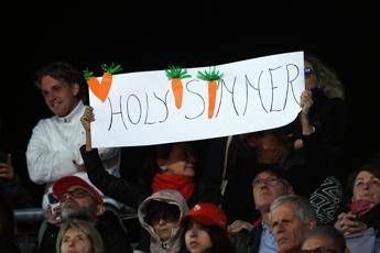 Jannik Sinner vola in finale agli Internazionali d'Italia 2025. Il tennista azzurro ha battuto oggi, venerdì 16 maggio, Tommy Paul nella semifinale del Masters 1000 di Roma, spinto da un Centrale ancora una volta sold out. Fin dalla mattina al Foro Italico sono spuntate magliette e cappelli color 'carota', con lo stadio che si è colorato d'arancione e ha sventolato diverse bandiere italiane. Sugli spalti sono apparsi, come nei precedenti match dell'azzurro, diversi cartelloni. Una ragazza suggeriva la dieta perfetta: "Sleep, eat, tennis. Repeat. Go Jannik", ovvero "Dormi, mangia, tennis. Ripeti. Vai Jannik". Un bambino invece aveva in mano il cartellone: "Sinner ottavo re di Roma", mentre un altro ha avuto un'ispirazione 'papale': "Habemus Sinner!", e ancora "Holy Sinner", ovvero "Santo Sinner". Tanti i cori del Centrale dedicati all'azzurro. Dai classici "let's go Jannik" e "vai Sinner", alla loro traduzione romana: "Daje Jannik!", passando per la sua variabile "daje roscio". Durante il secondo set, vinto dall'azzurro con un netto 6-0, un signore ha urlato: "Paul, te c'ha fatto crede", scatenando le risate dello stadio. Poi un suggerimento all'americano: "Tommy, alza bandiera bianca". Durante la fine del terzo set, durante il turno di servizio di Sinner, si è ripetuto l'incitamento del pubblico romano: "Daje Jannik, che c'ho fame". —sportwebinfo@adnkronos.com (Web Info)