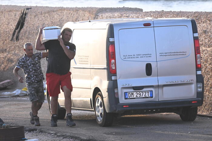The body of a newborn baby was landed at the Favarolo pier in Lampedusa by a patrol boat of the Capitaneria which saved a group of migrants in the waters in front of the island in Lampedusa, 16 September 2023. A record number of migrants and refugees have arrived on the Italian island of Lampedusa in recent days. Lampedusa's city council declared a state of emergency on 13 September evening after a 48-hour continuous influx of migrants. ANSA/CIRO FUSCO SIMBOLICA /BAMBINI/ BARA /MIGRANTI/SBARCHI/LAMPEDUSA