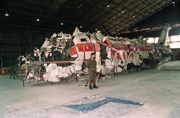 Il relitto dell'aereo di linea DC9 della compagnia aerea italiana Itavia (precipitato vicino all'isola di Ustica, il 27 giugno 1980, facendo 81 vittime) ricostruito nell'hangar di Pratica Di Mare, Roma, il 15 dicembre 2003. ANSA